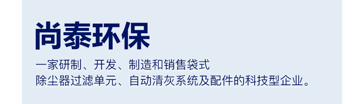 上海尚泰環保配件有限公司創立于2006年5月,是一家研制、開發、制造和銷售袋式除塵器過濾單元、自動清灰系統及配件的科技型企業。